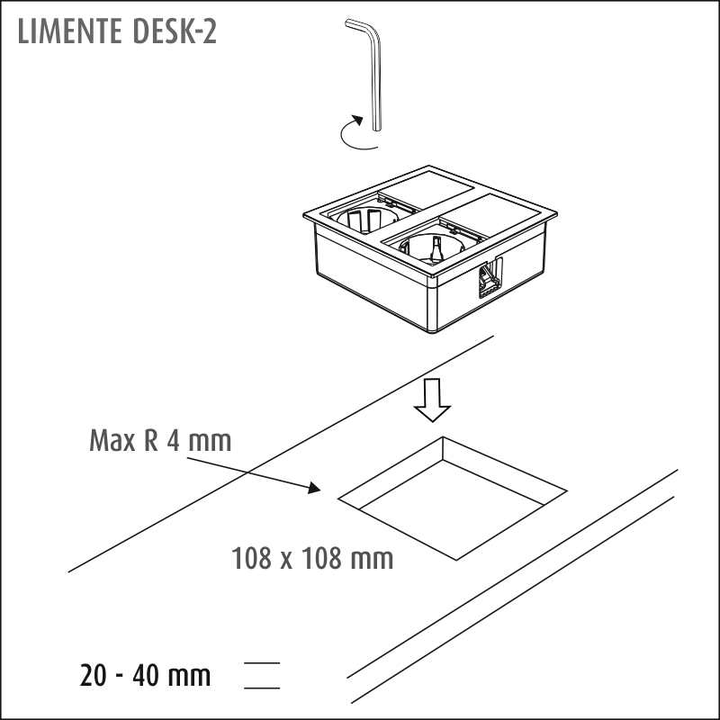 The socket must be installed on a surface with a material thickness of at least 15 mm. There is no upper limit to the material thickness if it is a wooden surface, but if it is a stone or glass surface, the material thickness must be between 15mm-20mm. NOTE! The installation hole of the socket is supposed to be tight but when installing on a stone and glass surface, the installation hole should be made according to the upper tolerance limit (+0,5mm), so that the socket easily sinks into the installation opening. Make a square hole in the tabletop or kitchen island, into which the power socket is attached with integrated attachment brackets. Desk-socket includes a fixed 2m cord and a detachable plug. To facilitate installation and cable routing, the plug is supplied separately and attached at the installation site.