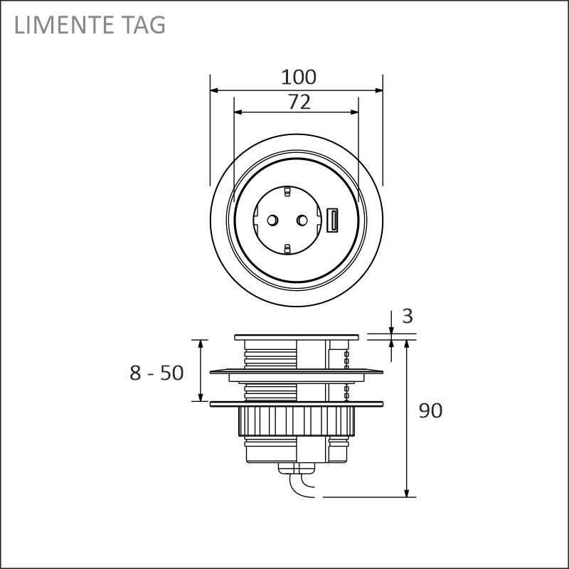 TAG is an affordable, inconspicuous and stylish socket designed for kitchen and office use. The socket includes a Schuko socket and a USB connection (USB-A or USB-C). The socket can be installed either in a 60 mm diameter hole or, with the supplied extension ring in a hole with a diameter of 80 mm.