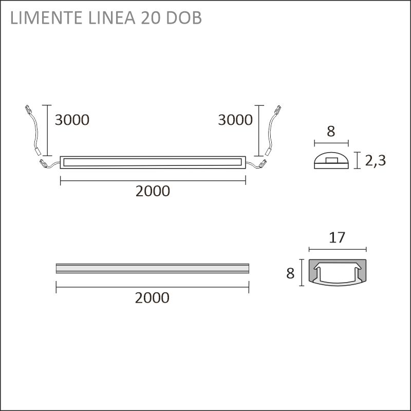 LIMENTE LINEA DOBin vakiopituudet ovat 2 ja 4 m ja led-nauhan voi lyhentää haluttuun mittaan noin 3 cm välein, mikä mahdollistaa erilaiset, yksilölliset ratkaisut. Kaapelikourun ja kulmapalojen ansiosta syöttöjohdot saadaan tyylikkäästi piiloon. Kulmapalat ja kiinnikkeet ovat samanvärisiä kuin valittu profiili (alumiini, valkoinen, musta). Valaisimessa käytetään laadukkaita ledejä, joiden värintoistoindeksi on CRI>90, hyötysuhde 144 lm/W, valoteho 1300 lm/m ja värilämpötila noin 3000 K tai 4000 K. Kaikki valaistusarvot on annettu led-nauhalle ilman suojusta.