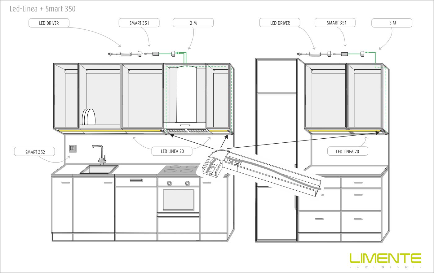 LIMENTE välitilasetti on monipuolinen, lyhennettävissä oleva työ- ja tunnelmavalaisin, jota voidaan käyttää keittiön työskentelyvalaistuksen lisäksi epäsuorana valona kaapin päällä, syvennyksissä, sokkeleissa, katoissa yms. Valo on tyylikkään jatkuva ilman valon katkaisevia liitoskohtia ja yhtenäinen profiili antaa tasaisesti valoa koko alueelle. Keittiön välitilassa profiili sijoitetaan lähelle yläkaapin etureunaa. Välitilasetti sisältää kaikki tarvittavat osat himmennettävän välitilavalaistuksen tekemiseen.